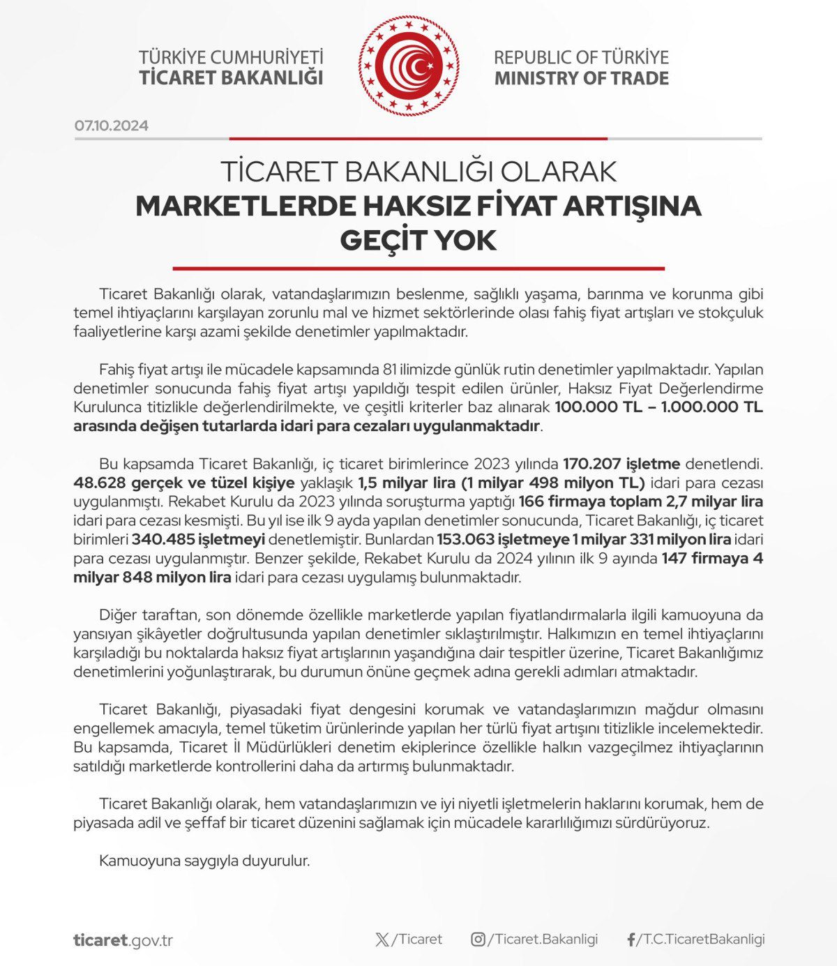 Ticaret Bakanlığı’nın resmi açıklamasında, “Ticaret Bakanlığı olarak, vatandaşlarımızın beslenme, sağlıklı yaşama, barınma ve korunma üzere temel muhtaçlıklarını karşılayan mecburî mal ve hizmet kesiminde mümkün fahiş fiyat artışları ve stokçuluk faaliyetlerine karşı azami halde kontroller yapılmaktadır.” denildi.