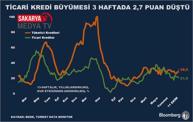 13 haftalık yıllıklandırılmış ve kur etkisinden arındırılmış büyüme ticari kredilerde 11 Ekim haftasında yüzde 21,5 olarak izlendi.