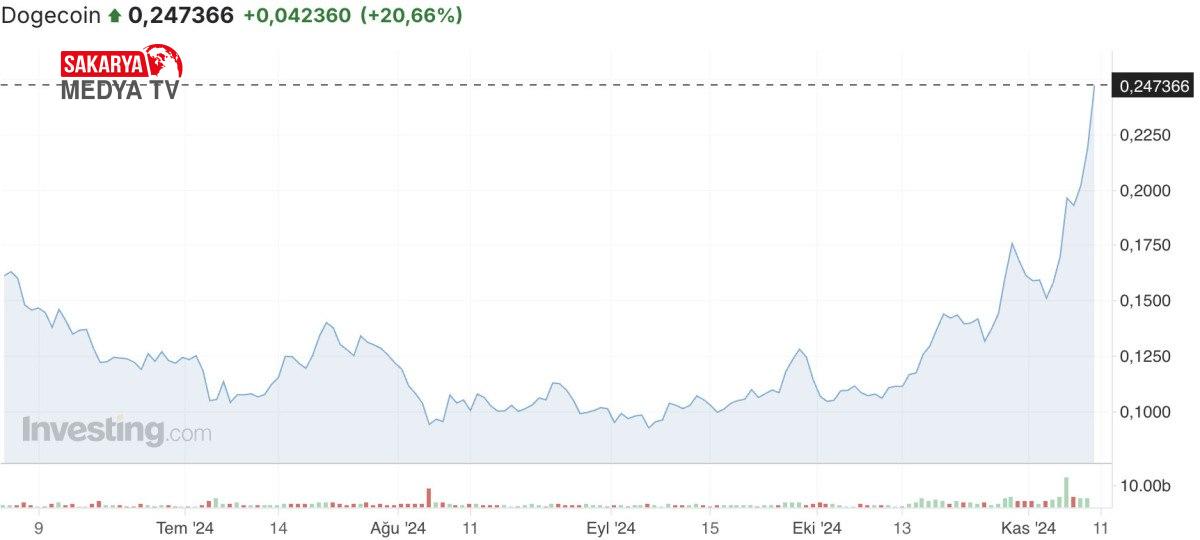 Dogecoin, Trump’ın kazanacağına dair beklentilerle yükseliş ivmesine girmişti. ABD’deki seçimi olan 5 Kasım’da ise yüzde 25 yükselerek 0,2 dolar fiyat seviyesine yaklaştı.