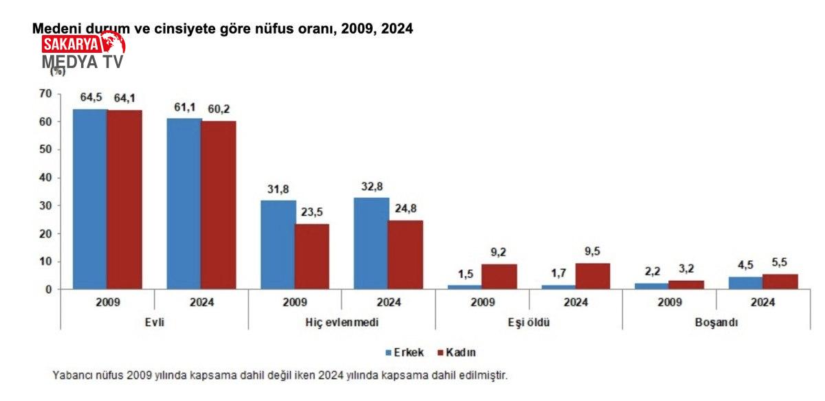 Ülkemizde 2009 ve 2024 yılı cinsiyete nazaran uygar durumun dağılımı incelendiğinde, erkeklerde hiç evlenmeyenlerin oranının bayanlara nazaran daha yüksek olduğu, bayanlarda ise eşi ölenlerin ve boşananların oranının erkeklerden daha fazla olduğu görüldü.