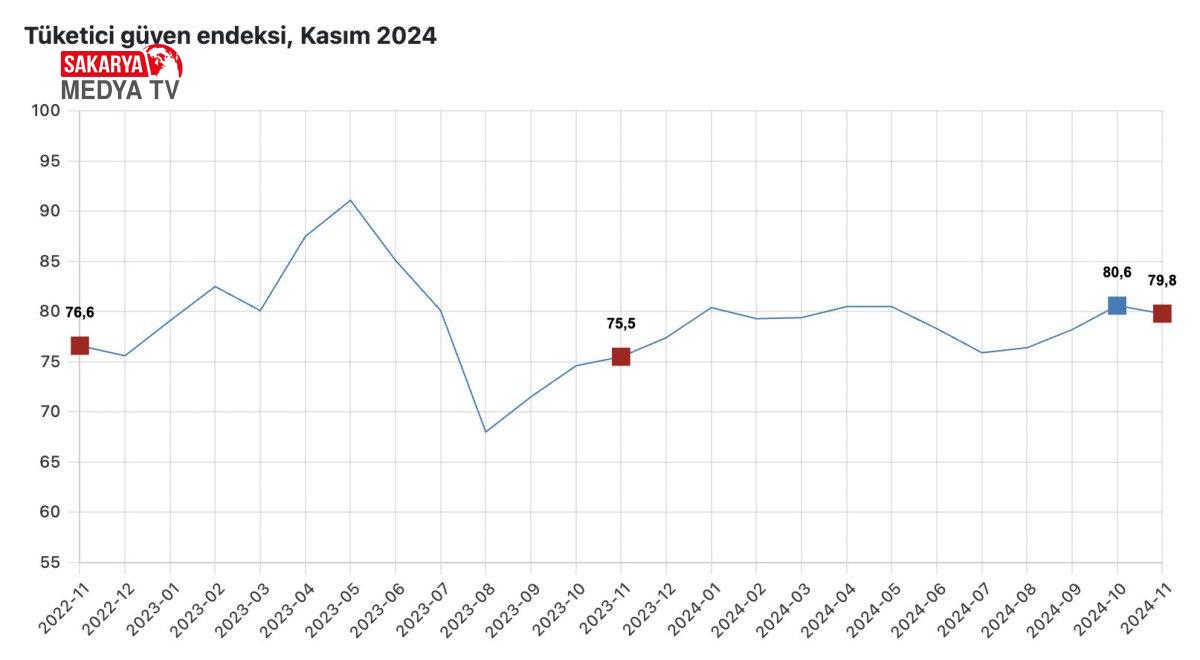 TÜİK ve Türkiye Cumhuriyet Merkez Bankası (TCMB) iş birliği ile yürütülen tüketici eğilim anketi sonuçlarından hesaplanan tüketici inanç endeksi, ekim ayında 80,6 iken Kasım ayında yüzde 1 oranında azalarak 79,8 oldu.