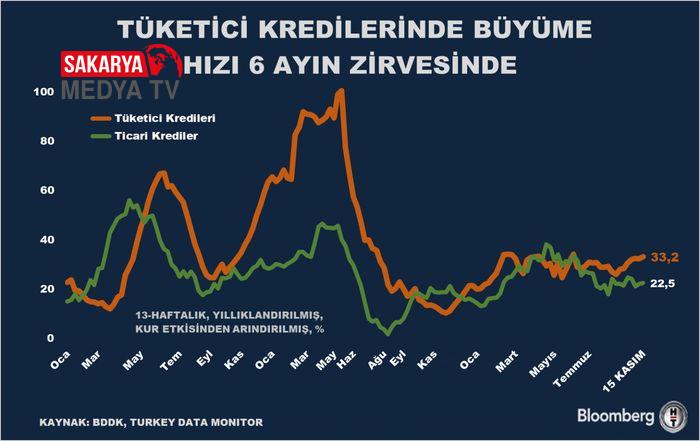 Tüketici kredilerinde ise büyüme daha hızlı bir artış gösterdi. Altı ayın zirvesini gören büyüme hızı yüzde 33,2 olarak gerçekleşti. Tüketici kredilerinde büyüme 8 Kasım haftasında yüzde 32,3 olarak olarak kaydedilmişti.