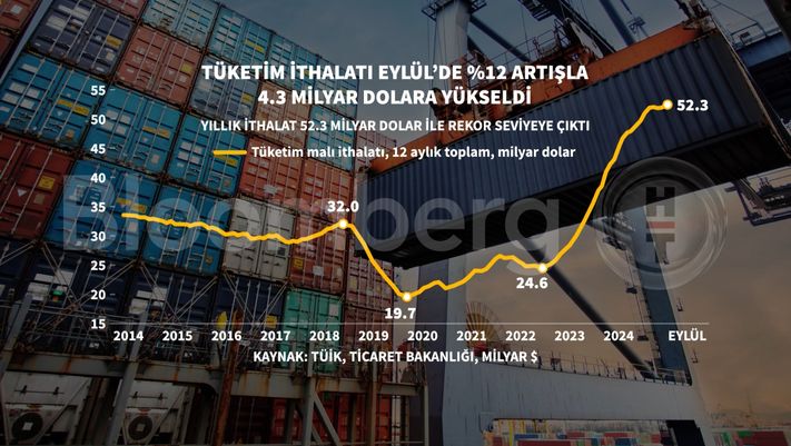 Eylül ayıyla birlikte son 12 ayda yapılan tüketim malı ithalatı 52,3 milyar dolara çıktı. Böylelikle tüketim malı ithalatında yeni tarihi zirve kaydedildi.