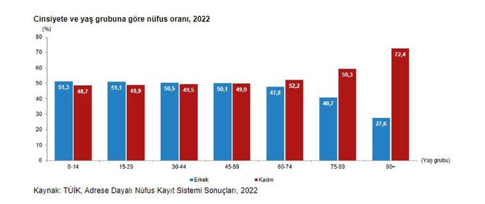 Kadınlar ile erkekler arasındaki bu oransal denge, kadınların daha uzun yaşaması nedeniyle, 60 ve daha yukarı yaş grubundan itibaren kadınların lehine değişti. Kadın nüfusun oranı, 60-74 yaş grubunda yüzde 52,2 iken 90 ve üzeri yaş grubunda yüzde 72,4 oldu.