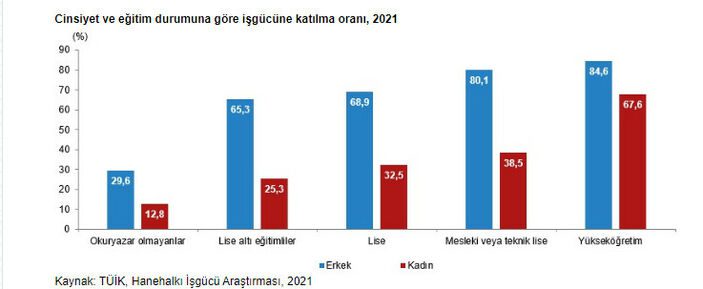 En az bir eğitim düzeyini tamamlayan 25 ve daha yukarı yaştaki kadınların oranı yüzde 87,3 oldu. Yükseköğretim mezunu olan 25 ve daha yukarı yaştaki kadınların oranı yüzde 20,9 oldu. Yükseköğretim mezunu kadınların işgücüne katılım oranı yüzde 67,6 oldu. Kadınların istihdam oranının erkeklerin yarısından daha az olduğu görüldü. Kadınların istihdamda yarı zamanlı çalışma oranı yüzde 16,4 oldu. Hanesinde 3 yaşın altında çocuğu olan 25-49 yaş grubundaki kadın istihdam oranı yüzde 26,1 oldu.