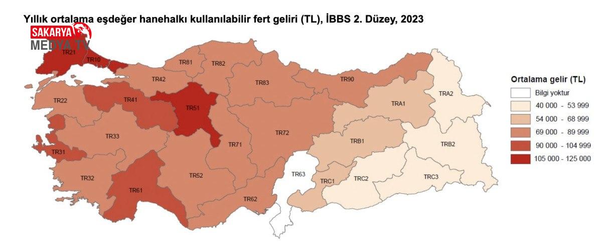 Araştırma sonuçlarına nazaran, Türkiye’de yıllık ortalama muadil hanehalkı kullanılabilir fert geliri 2023 yılında 90 bin 116 TL iken, İBBS 2. Seviye bölgeleri prestijiyle en yüksek olduğu bölge 124 bin 723 TL ile TR10 (İstanbul) bölgesi oldu. Bu bölgeyi, 115 bin 758 TL ile TR51 (Ankara) bölgesi ve 107 bin 583 TL ile TR21 (Tekirdağ, Edirne, Kırklareli) bölgesi izledi. En düşük yıllık ortalama muadil hanehalkı kullanılabilir fert geliri ise 41 bin 385 TL ile TRB2 (Van, Muş, Bitlis, Hakkari) bölgesinde gerçekleşti.
