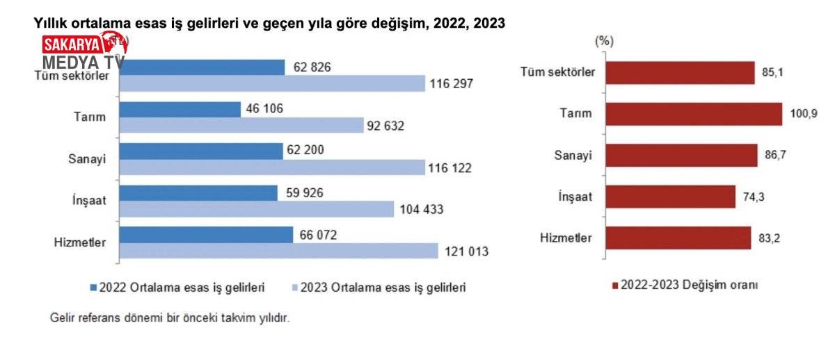 Esas iş gelirleri sektörel ayrımda incelendiğinde; en yüksek yıllık ortalama gelirin 121 bin 013 TL ile hizmet bölümünde, en düşük yıllık ortalama gelirin ise 92 bin 632 TL ile tarım bölümünde olduğu görüldü. Bir evvelki yıla nazaran; yıllık ortalama temel iş gelirinde en yüksek artış yüzde 100,9 ile tarım bölümünde gözlenirken, bunu yüzde 86,7 ile sanayi kesimi izledi. Başka taraftan hizmet dalında yüzde 83,2, inşaat bölümünde ise yüzde 74,3 artış gözlendi.