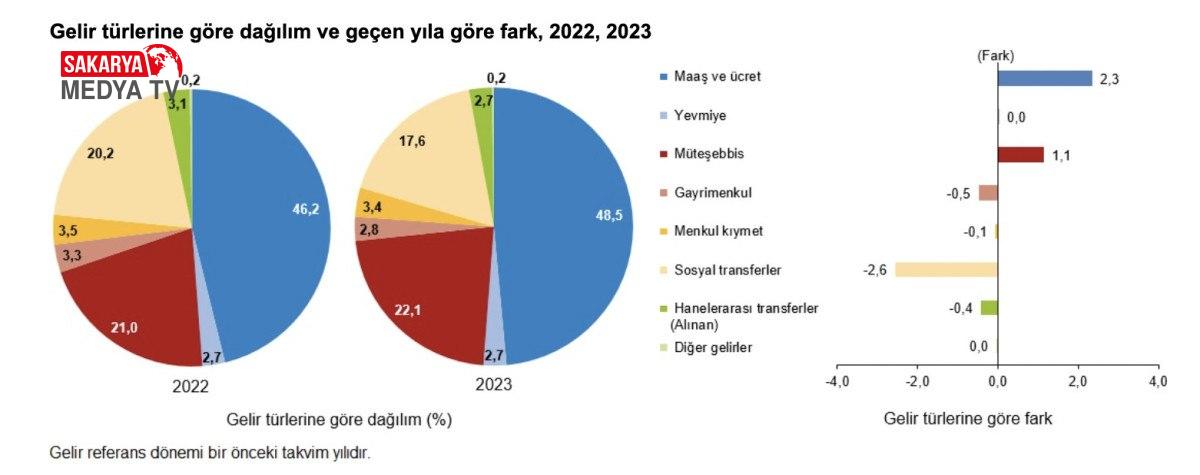 Toplam gelir içerisinde en yüksek hissesi, yüzde 48,5 ile bir evvelki yıla nazaran 2,3 puan artan maaş ve fiyat geliri aldı. İkinci sırayı yüzde 22,1 ile evvelki yıla nazaran 1,1 puan artan müteşebbis geliri alırken üçüncü sırayı yüzde 17,6 ile evvelki yıla nazaran 2,6 puanlık azalış gösteren toplumsal transfer geliri oluşturdu. Tarım gelirinin müteşebbis geliri içindeki hissesi yüzde 20,5 olurken, emekli ve dul-yetim aylıklarının toplumsal transferler içindeki hissesi ise yüzde 88,4 olarak gerçekleşti.