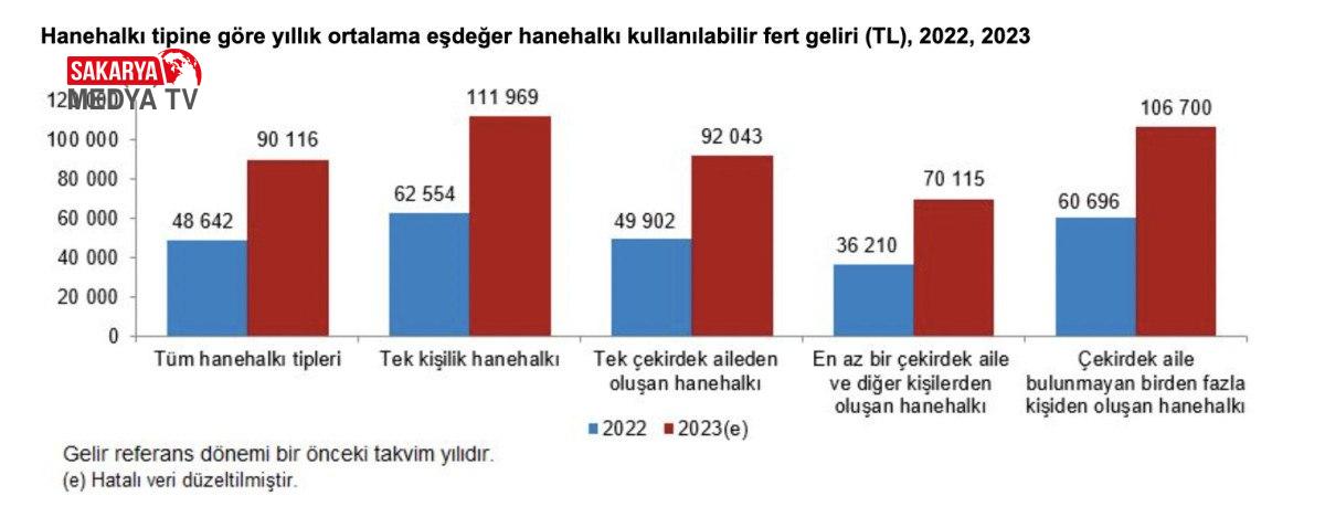 Türkiye’de yıllık ortalama muadil hanehalkı kullanılabilir fert geliri bir evvelki yıla nazaran yüzde 85,3 artarak 48 bin 642 TL’den 90 bin 116 TL’ye yükseldi.