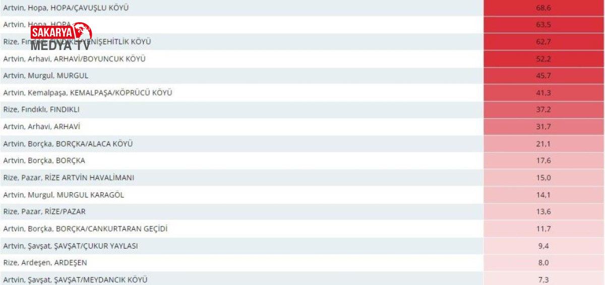 Açıklanan listeye nazaran; Türkiye’nin en çok yağış alan bölgesi 68,6 kilogram ile Artvin’in Hopa ilçesi Çavuşlu köyü oldu.