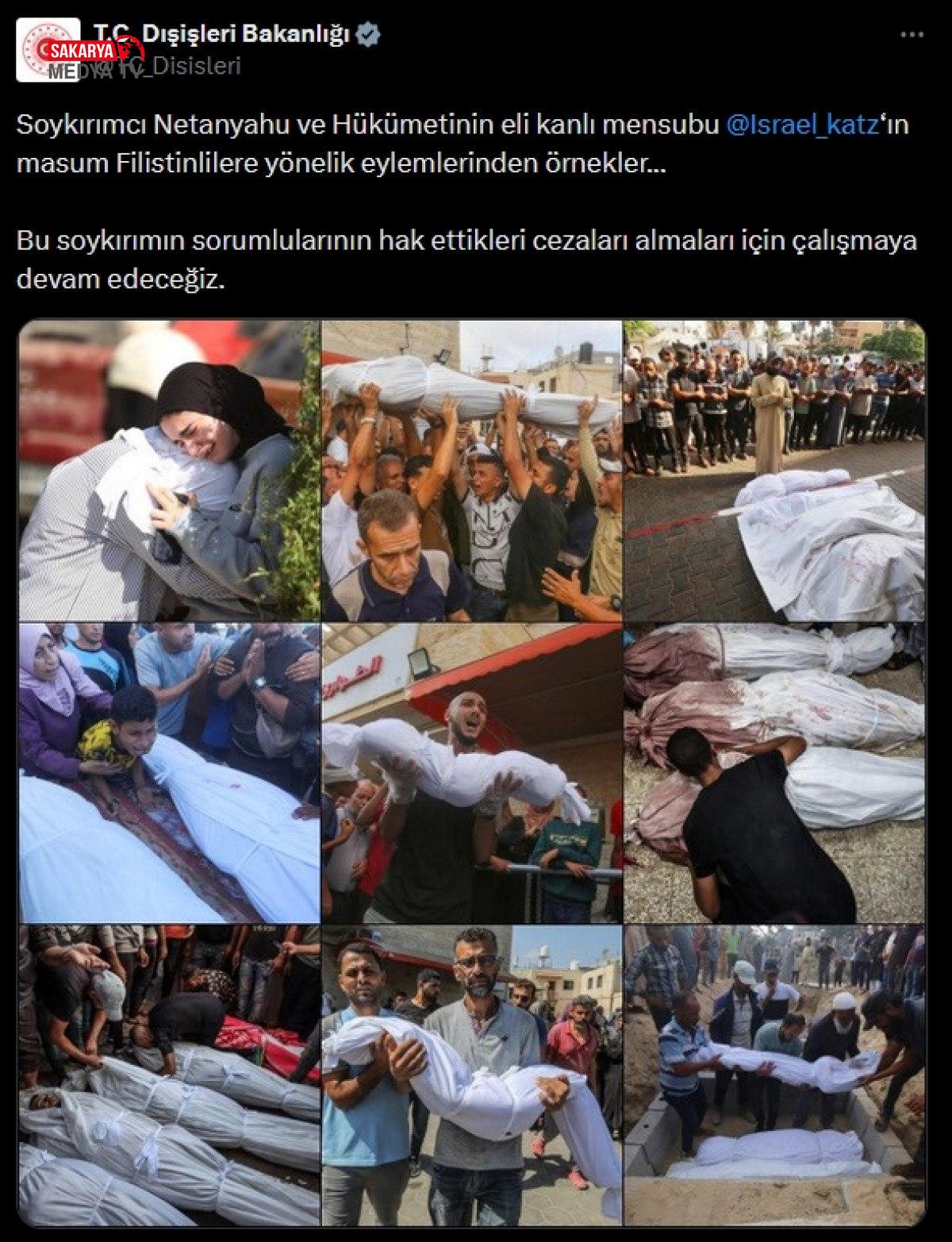 Dışişleri Bakanlığı’nın X toplumsal medya hesabından, İsrail’in günahsız Filistinlilere yönelik aksiyonlarına ve işlenen katliama ait paylaşım yapıldı.