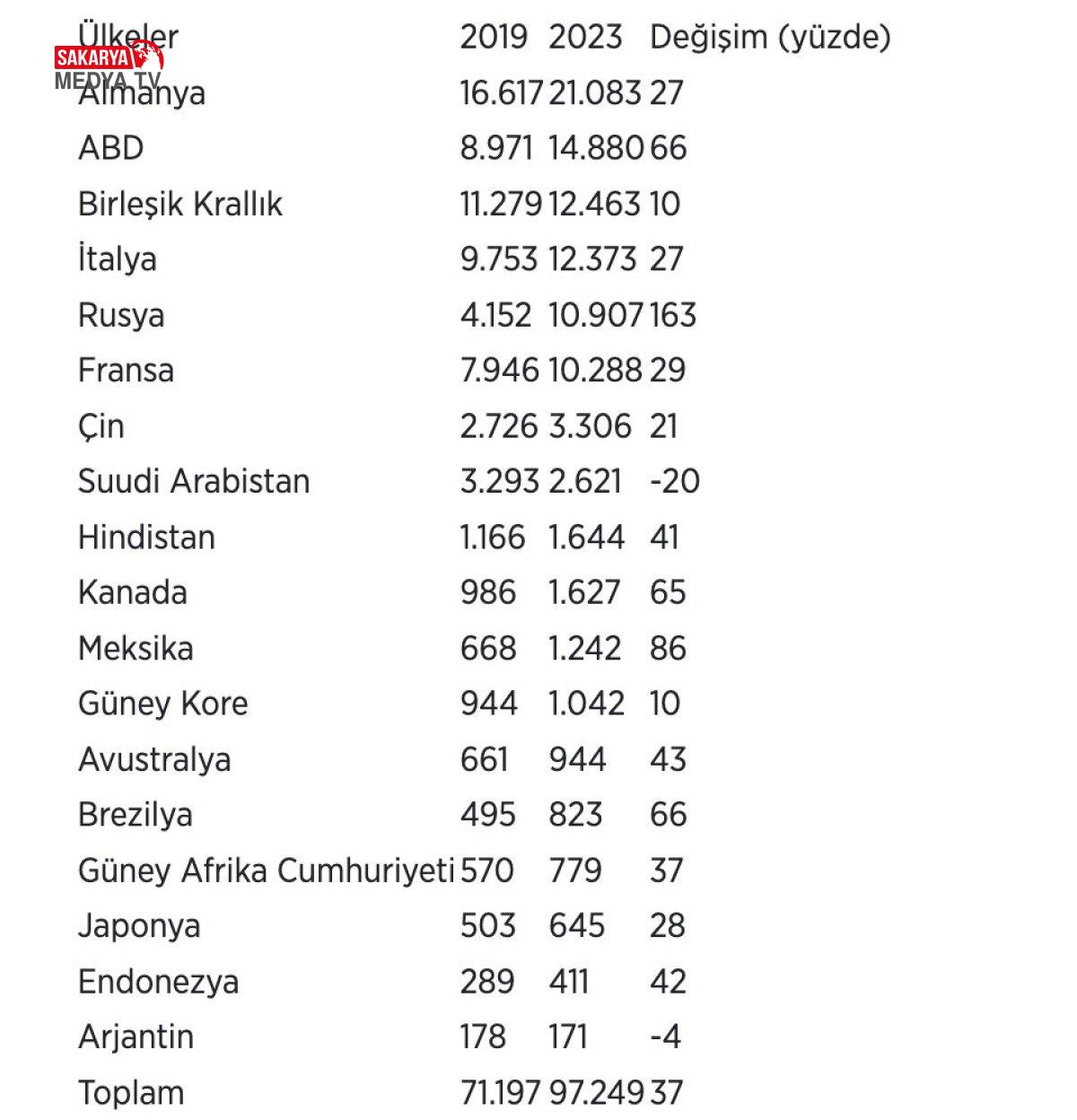 Türkiye, 2022’de 97 milyar 322 milyon dolarlık, geçen yıl ise 97 milyar 249 milyon dolarlık eseri kelam konusu ülkelere sattı.