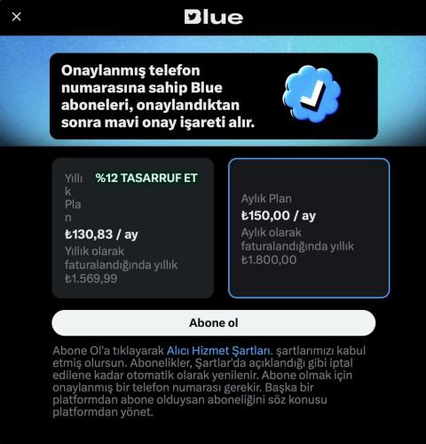 Webden alındığında Twitter Blue fiyatı; aylık 150 TL, yıllık 1569,99 TL. Twitter iOS uygulamasından alındığında, Twitter Blue ücreti; aylık 209 TL, yıllık 2199 TL.