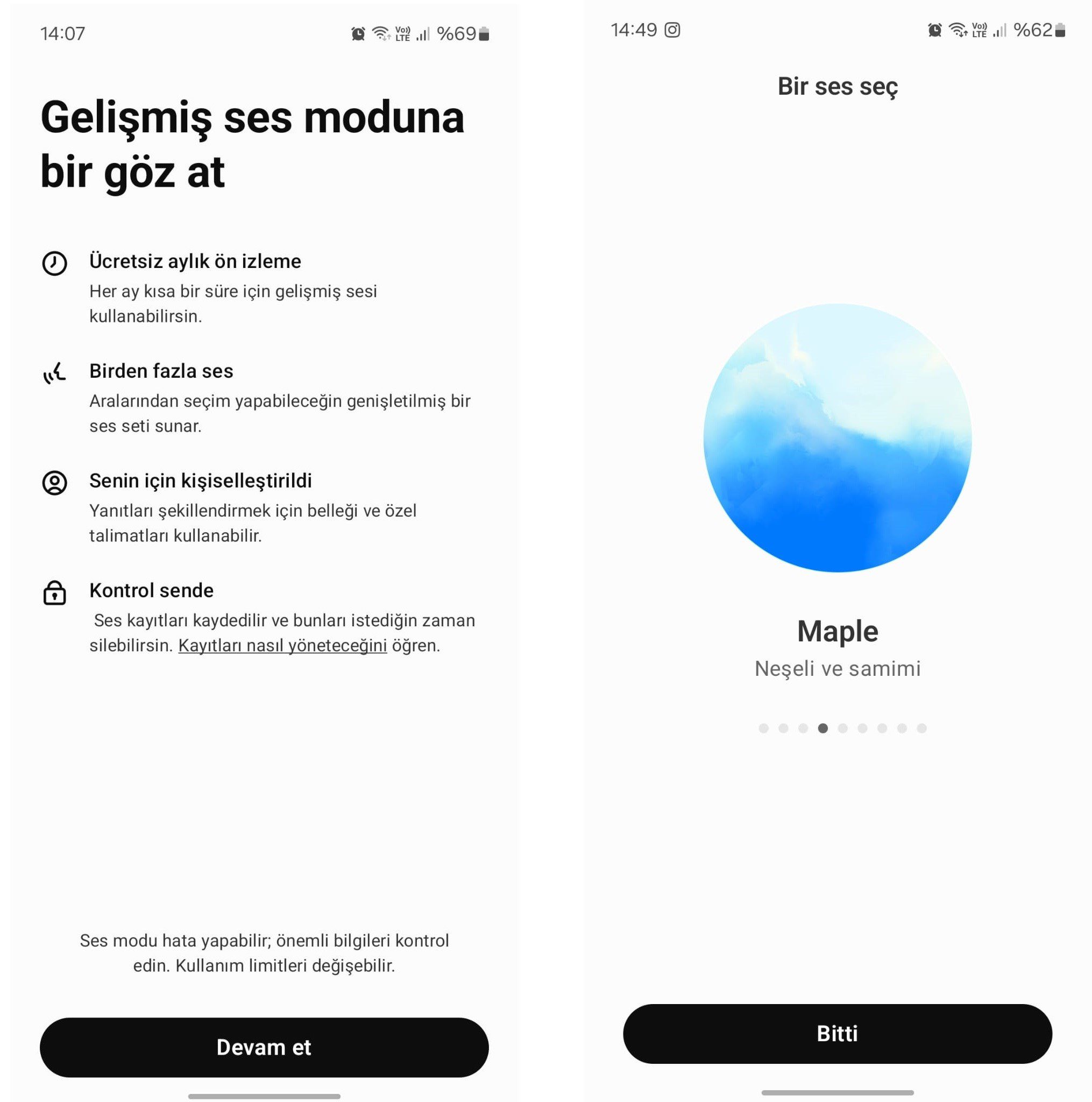Peki ChatGPT gelişmiş ses modu nasıl kullanılır? Bunun için öncelikle ChatGPT iOS ve Android uygulamasını son sürüme güncellemeniz gerekiyor. Ardından uygulamanın sağ altındaki simgeye dokunmanız gerekiyor. Bunu yaptıktan sonra yukarıdaki ekran görüntüsündeki gibi bir tanıtım ekranı göreceksiniz. “Devam et” seçeneği ile ilerlediğinizde uygulama, ses modu için kullanabileceğiniz 9 farklı sesten birini seçmenizi isteyecek. Bunu yaptıktan sonra konuşmaya başlayabilirsiniz.