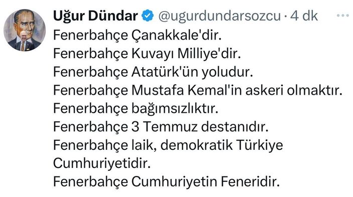 Dündar yaptığı paylaşımda Fenerbahçe’ye övgüler dizerek atılan siyasi sloganları bastırmaya çalıştı.