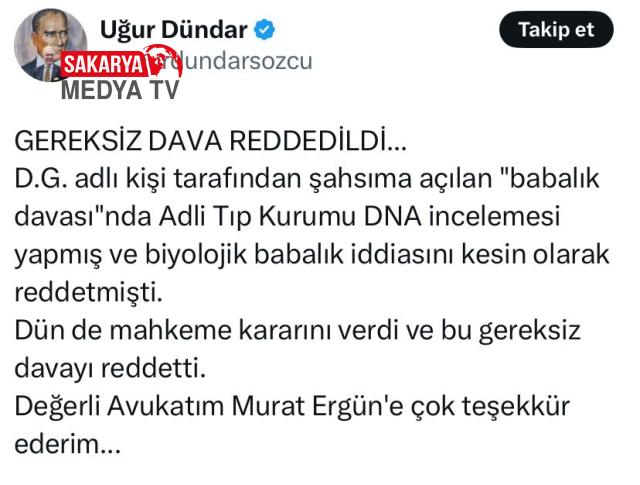 Kararın ardından sosyal medya hesabı üzerinden açıklama yapan Dündar, “Adli Tıp Kurumu DNA incelemesi, biyolojik babalık iddiasını kesin olarak reddetmişti. Dün de mahkeme kararını verdi ve bu gereksiz davayı reddetti” ifadelerine yer verdi.