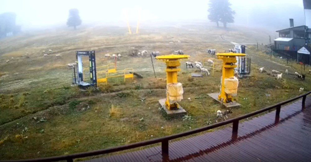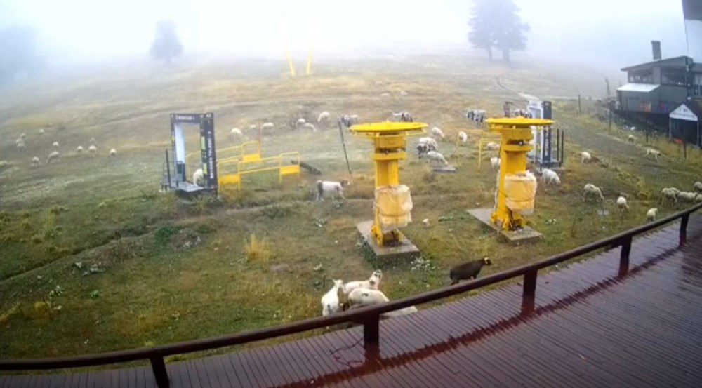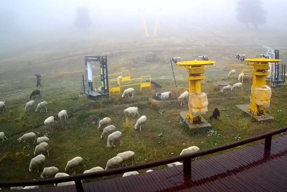 Sezon boyunca adım atmaya yer kalmayan pistte, başlarındaki çoban ve Kangal köpekleri ile otlayan koyun sürüsü, canlı yayın kamerasına yansıdı.