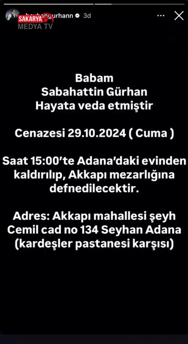 Sosyal medya hesabından acı haberi duyuran ünlü müzikçi, “Babam Sabahattin Gürhan hayata veda etmiştir. Cenazesi Cuma günü saat 15.00’te Adana’daki konutundan kaldırılıp Akkapı mezarlığına defnedilecektir” açıklamasında bulundu.
