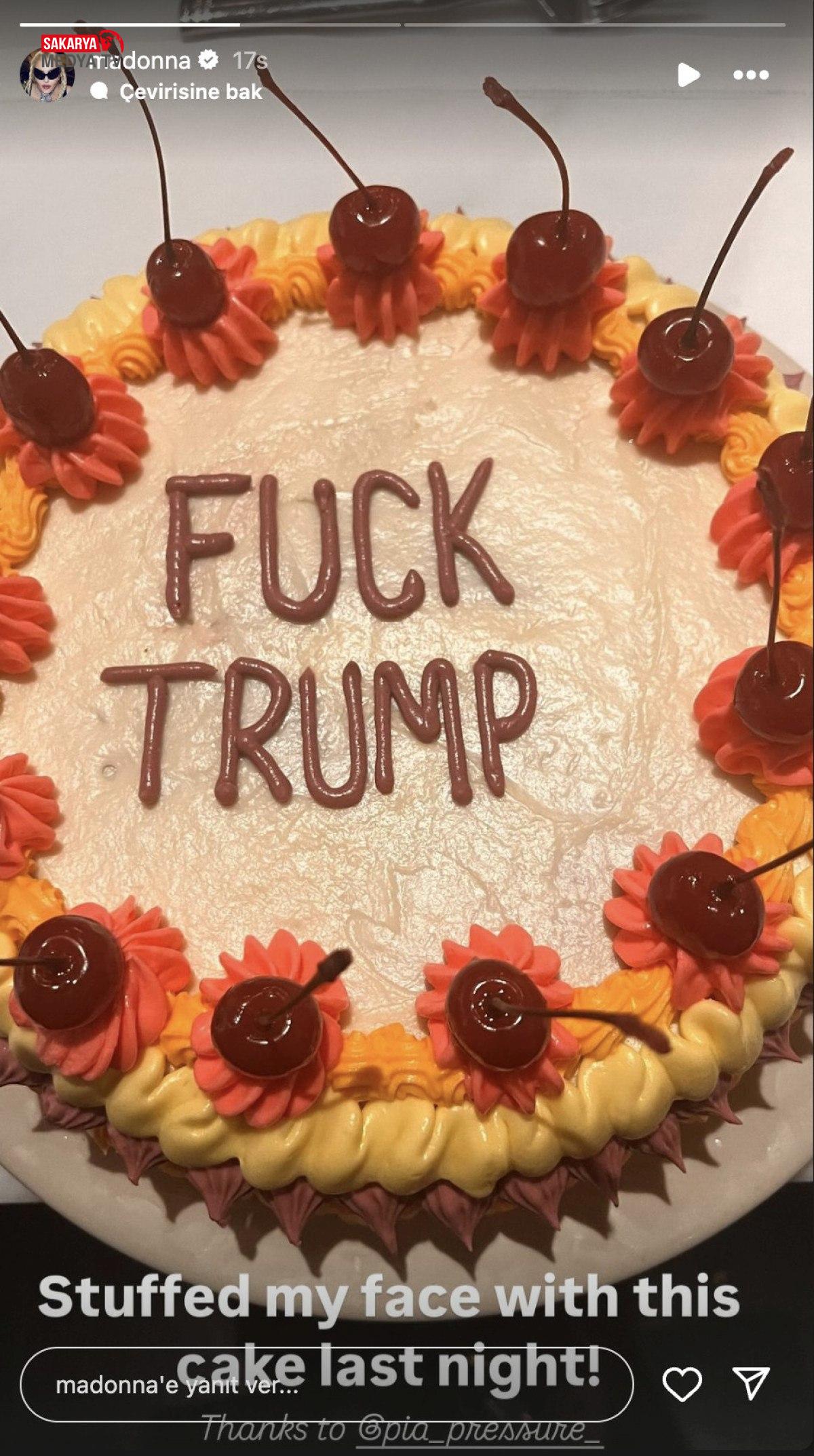 Üzerinde “Fuck Trump” yazılı bir pastanın fotoğrafını paylaşan Madonna, şu notu ekledi:Dün gece bu pastayı mideme indirdim!