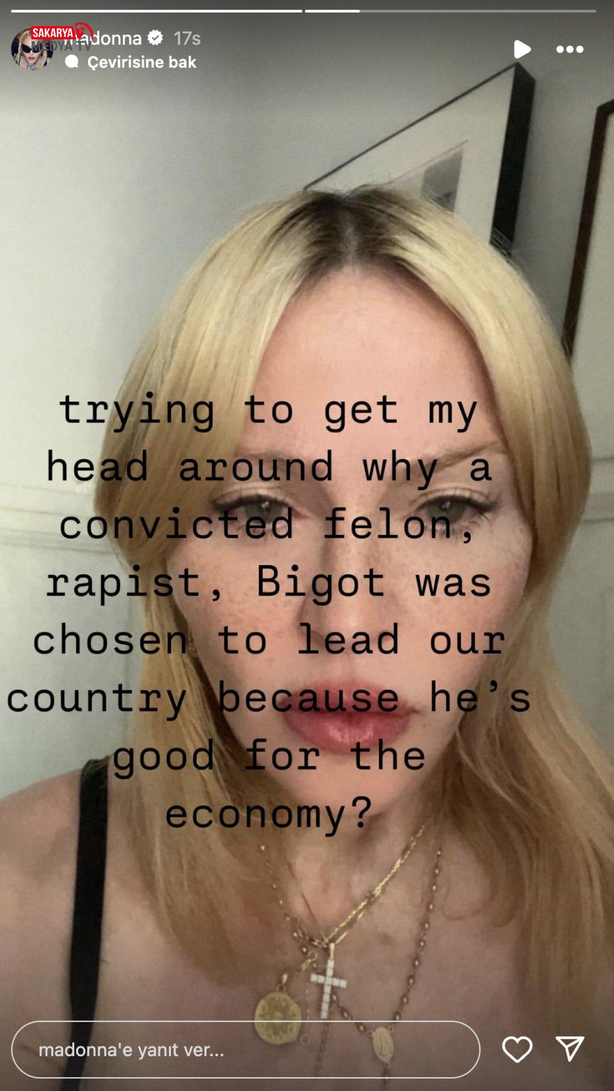 Madonna,Donald Trump’ın tekrar seçilmesine öfkesini lisana getirerek toplumsal medya hesabında şöyle dedi:Ekonomiye uygun geliyor diye karar giymiş hatalı, tecavüzcü ve yobaz birinin neden ülkemizi yönetmek üzere seçildiğini anlamaya çalışıyorum.