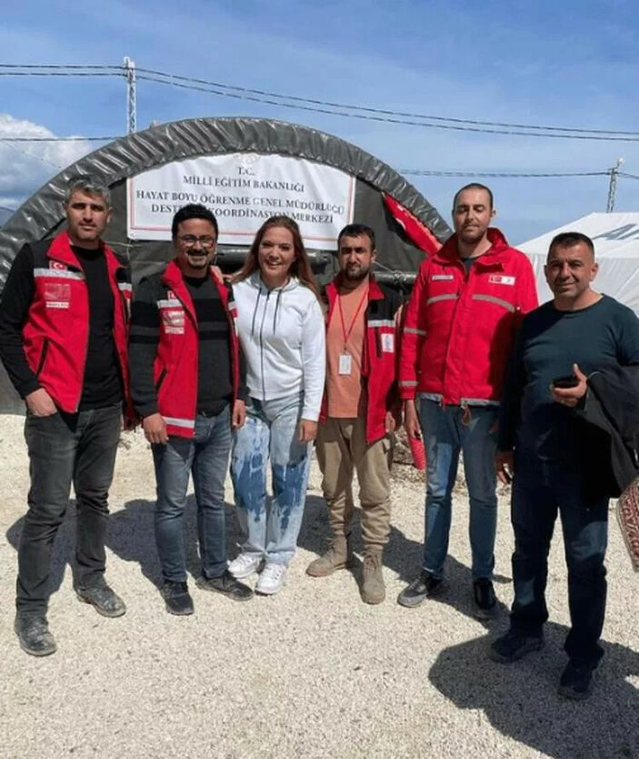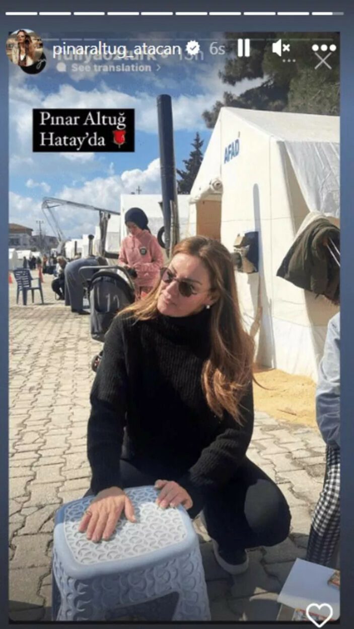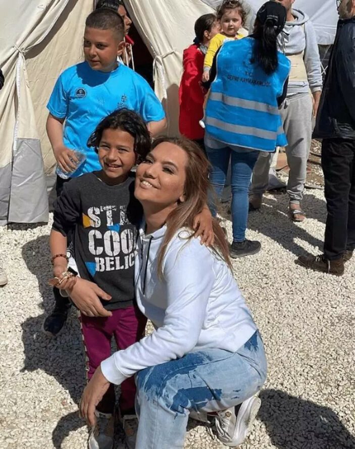 Pınar Altuğ da aynı gün yine Hatay’da başka bir çadır kentte depremzedelerin dertlerini dinleyip moral verdi.