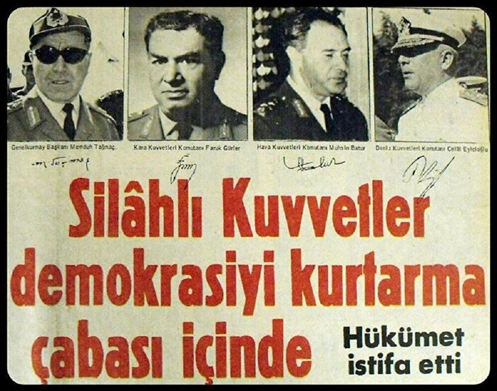 Darbeye adı karışan ve orgeneral rütbesinden daha kıdemsiz olanlar resen emekliye sevk edilmişlerdi. Ve 12 Mart darbesi başlıyorBu istikrarsız dönemde gerçekleşen banka soygunları, adam kaçırmalar, üniversite işgalleri, öğrenci olayları, fabrikalardaki grevler, işçi yürüyüşleri ve sıkıyönetim uygulamaları ortamı iyice germişti. Ayrıca basının en büyükleri olan, Simavi kardeşlerin patronajındaki Hürriyet ve Günaydın gazeteleri de hükümete sürekli olarak yolsuzluk iddialarıyla saldırıyordu. Nihayet 12 Mart 1971 tarihinde Genelkurmay Başkanı Memduh Tağmaç, Kara Kuvvetleri Komutanı Faruk Gürler, Deniz Kuvvetleri Komutanı Celal Eyiceoğlu ve Hava Kuvvetleri Komutanı Muhsin Batur imzasıyla hazırlanan muhtıra metni, Cumhurbaşkanı ve TBMM ve Senato Başkanlıklarına ulaştırıldıktan sonra tüm ülkeye duyurulmak için TRT’ye gönderilmiş ve saat 13.00’te TRT’de okunmuştu.
