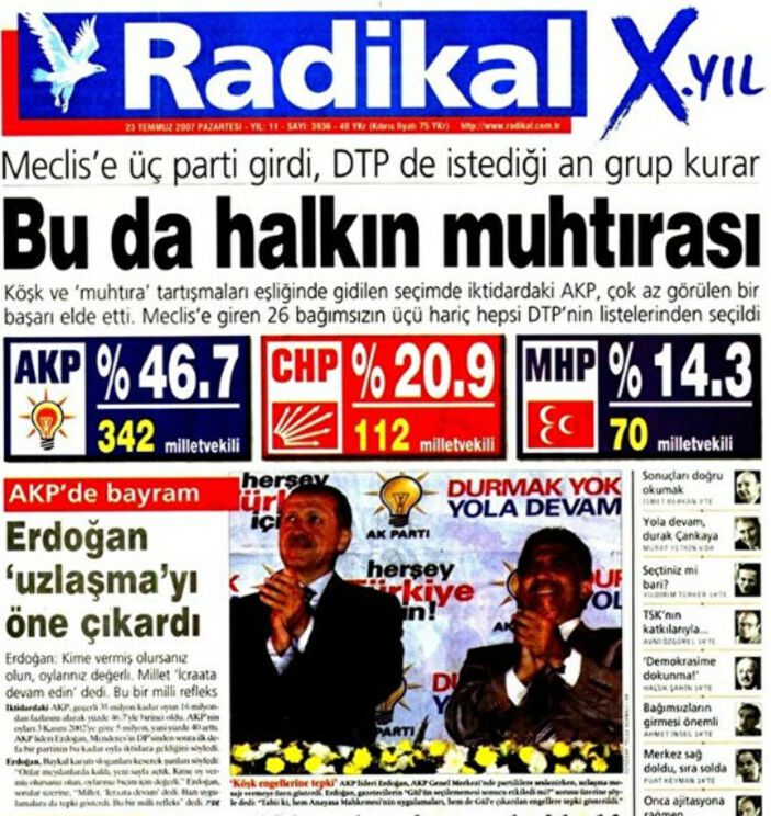 Zira AK Parti 2007 seçimlerinde yüzde 46,58 ile 341 milletvekili çıkartmıştı. Seçimlerde CHP yüzde 20,88 ile 112 milletvekili, MHP ise yüzde 14,27 ile 71 milletvekiline sahip olmuştu. DTP’nin desteklediği “Bin Umut Adayları” da 22 milletvekilliği kazanırken, 4 de bağımsız aday Meclis’e girmişti.