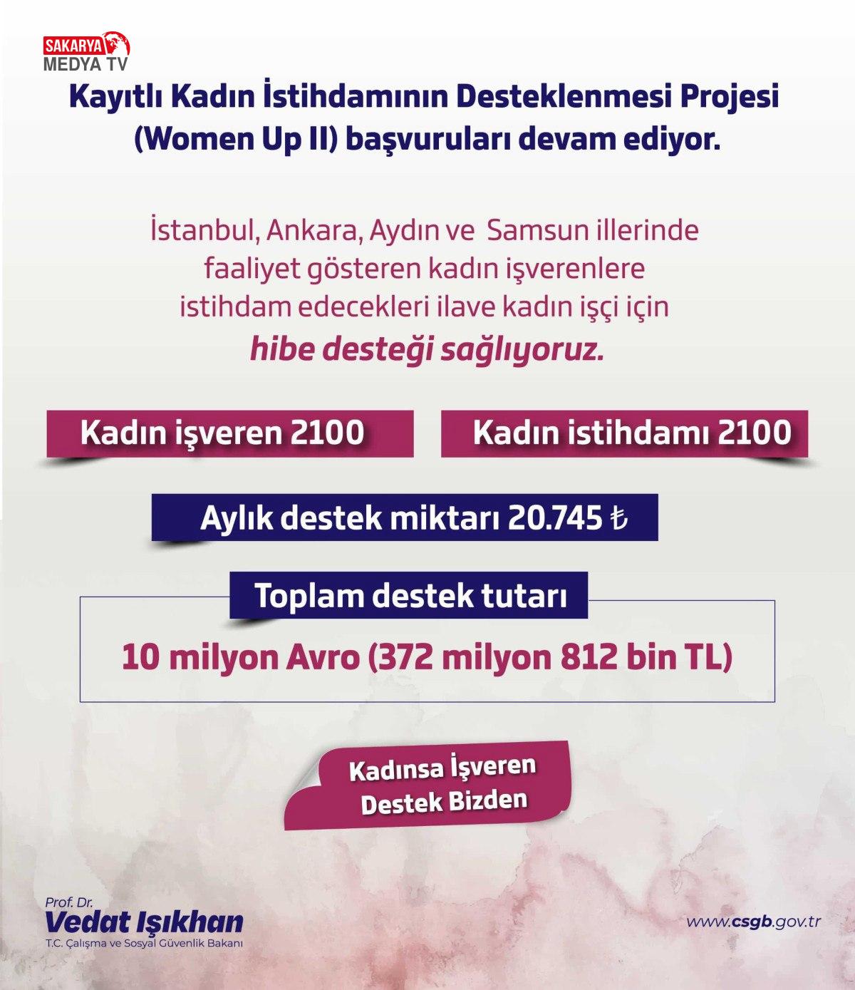 Işıkhan’ın projeye ait paylaştığı görselde de “İstanbul, Ankara, Aydın ve Samsun vilayetlerinde faaliyet gösteren bayan patronlara istihdam edecekleri ilave bayan personel için hibe takviyesi sağlıyoruz.” sözlerine yer verildi.