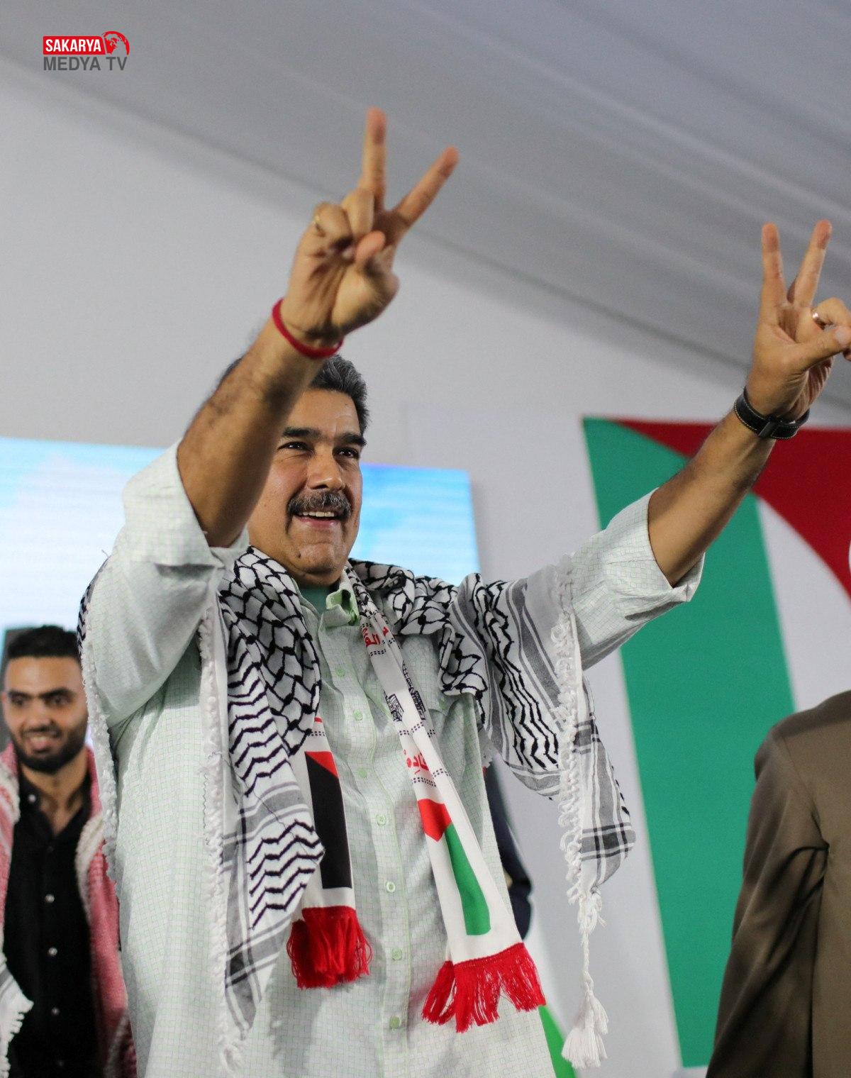 Maduro, “Adil bir dünya yaratmak için geçen yüzyıldan miras kalan gayretlerin münasebetlerine bakarsanız, Filistin davası, insanlığın en haklı davasıdır. Bu, insanlığı birleştiren bir davadır.” tabirini kullandı.