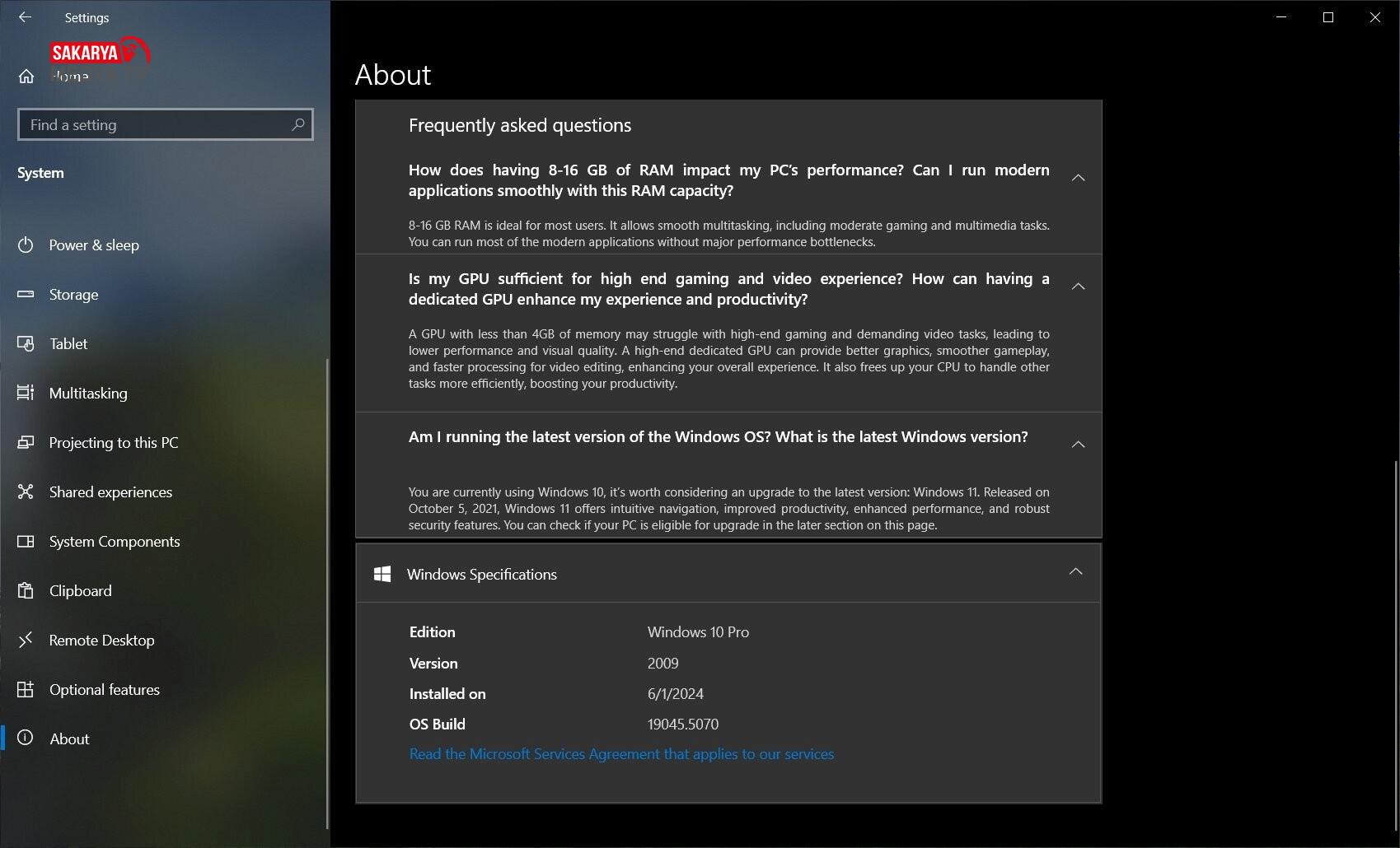 Yeni yayınlanan Windows 10 beta sürümünde (19045.5070 / KB5045594) Hakkında sayfasının ekran kartı modeli, video belleği miktarı, depolama alanı ve sürücü modeli gibi detaylı bilgiler sunduğu görülüyor. Ayrıca kullanıcıların bilgisayarları hakkında daha fazla bilgi edinebilecekleri küçük bir SSS bölümü dikkat çekiyor. Burada RAM miktarının performansı nasıl etkilediği, en son Windows sürümünün ne olduğu gibi yeni Windows PC kullanıcıları için faydalı bilgiler veriliyor. Microsoft, Windows 10’a desteği kesiyor
