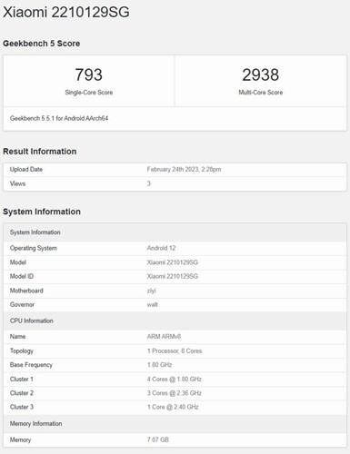 Yaklaşmakta olan Xiaomi 13 Lite, Geekbench sertifika sitesinde 2210129SG model numarasıyla listelendi. Listeye göre 8GB RAM ile gelecek cihaz, Snapdragon 7 Gen 1 SoC tarafından desteklenecek. Android 12 tabanlı MIUI 13 ile kutudan çıkacak cihaz, tek çekirdekli testlerde 793 ve çok çekirdekli testlerde 2.938 skora sahip.