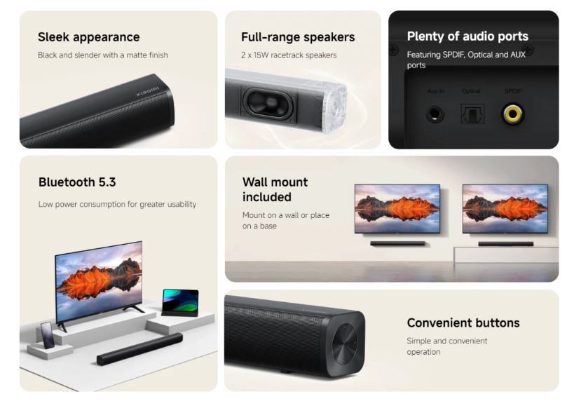 Ses bağlantı seçenekleri açısından Xiaomi Soundbar 2.0ch oldukça geniş bir yelpaze sunuyor. Optik dijital giriş, koaksiyel giriş, SPDIF ve 3.5 mm AUX gibi kablolu bağlantı seçenekleri mevcut. Ancak, HDMI desteği bulunmuyor. Kablosuz bağlantı için Bluetooth 5.3 özelliği ile birlikte geliyor. Ayrıca, ses sisteminin duvara monte edilebilmesi için kutu içeriğinde bir montaj aparatı da sunuluyor.