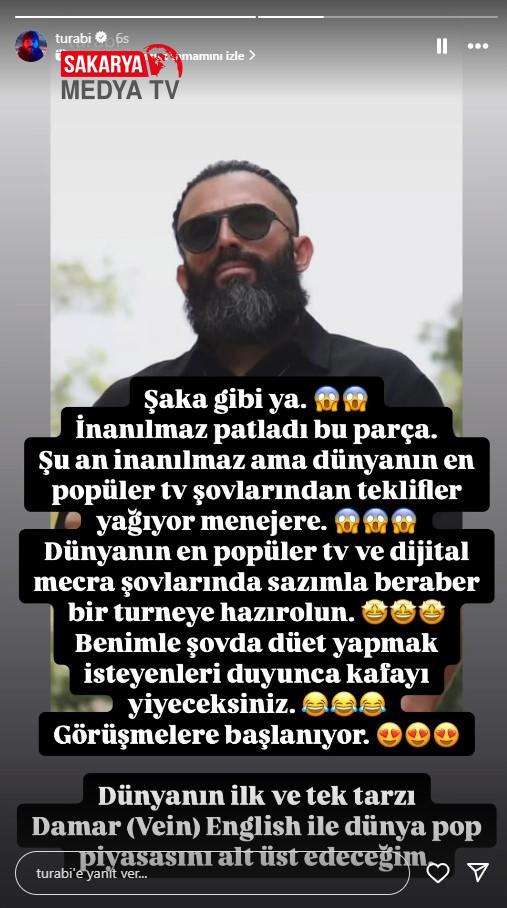 Şarkısı büyük ilgi çeken Turabi, toplumsal medya hesabından yeni bir paylaşım yaparak, “Şaka üzere ya. İnanılmaz patladı bu kesim. Şu an inanılmaz ancak dünyanın en popüler tv gösterilerinden teklifler yağıyor menajere. Dünyanın en tanınan ve dijital mecra gösterilerinde sazımla birlikte bir turneye hazır olun. Benimle gösteride düet yapmak isteyenleri duyunca kafayı yiyeceksiniz” dedi.