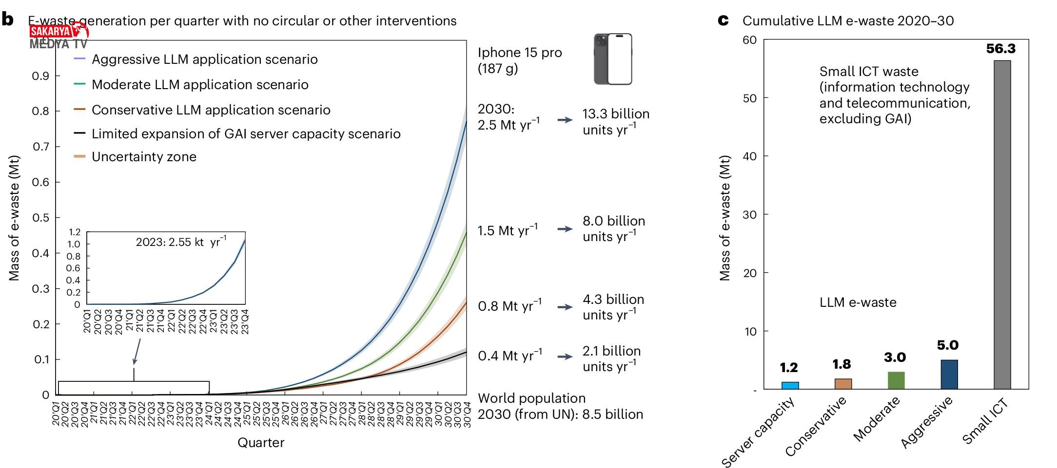 2023 yılında yalnızca 2.600 ton olan yapay zeka kaynaklı elektronik atık miktarının, 2030‘da 2,5 milyon tona ulaşabileceği tahmin ediliyor. Bu rakam, 2030 yılında dünyanın 8,5 milyarlık tahmini nüfusunun her birinin yaklaşık iki iPhone’u çöpe atmasına eşdeğer. Çalışma, 2030’a kadarki sürede toplamda 5 milyon tondan fazla atık birikebileceğini öngörüyor. 2022 yılında küresel çapta 62 milyon tonluk e-atık üretilmişti.