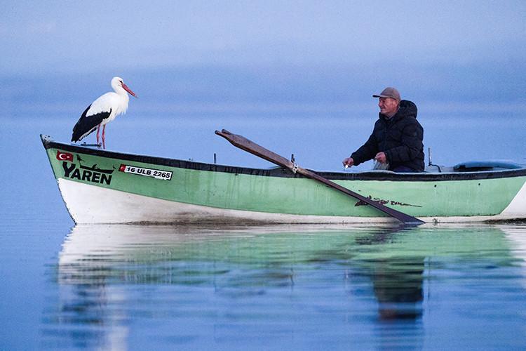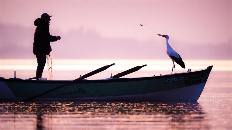 Yaren leyleğin, göl görünümlü yuvasının bulunduğu mahallede balıkçı Yılmaz’ın kayığındaki “geleneksel” pozu, tabiat ve yaban hayatı fotoğrafçısı Alper Tüydeş tarafından kayda alındı.