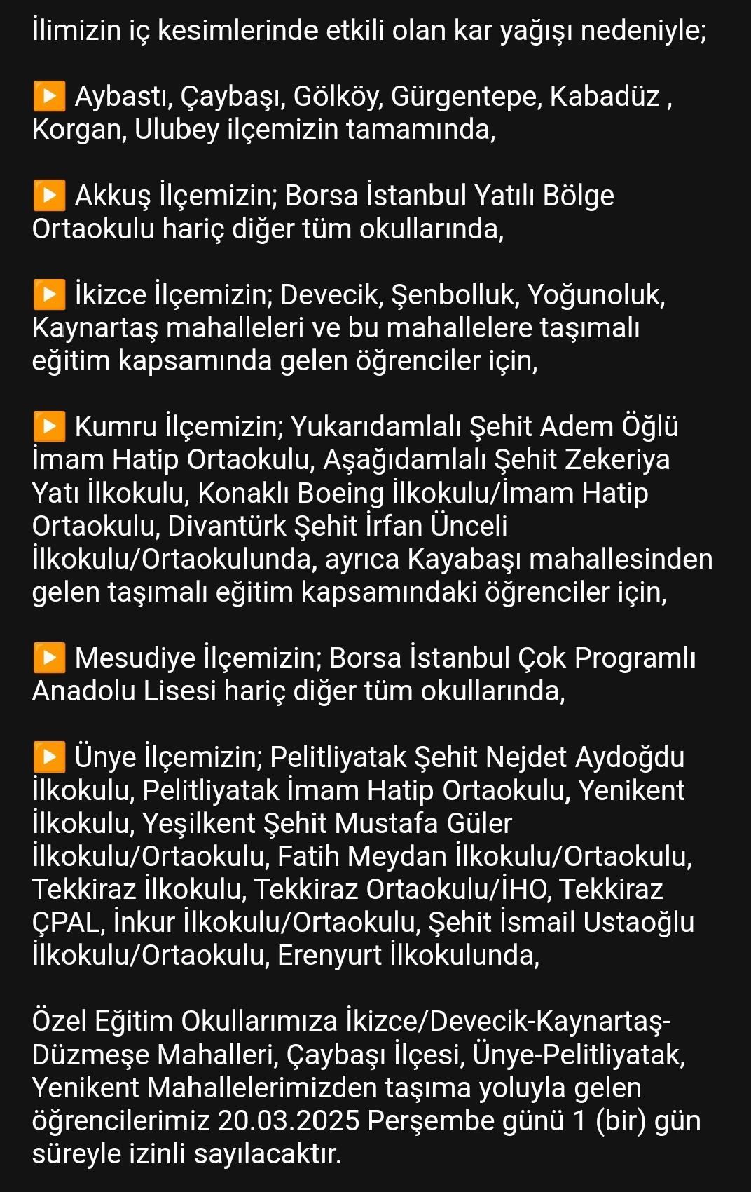 Açıklamada, Aybastı, Çaybaşı, Gölköy, Gürgentepe, Kabadüz, Korgan ve Ulubey ilçelerindeki tüm okullarda, Akkuş, İkizce, Kumru, Mesudiye ile Ünye ilçelerinde ise birtakım okullarda yarın için eğitime orta verildiği tabir edildi.