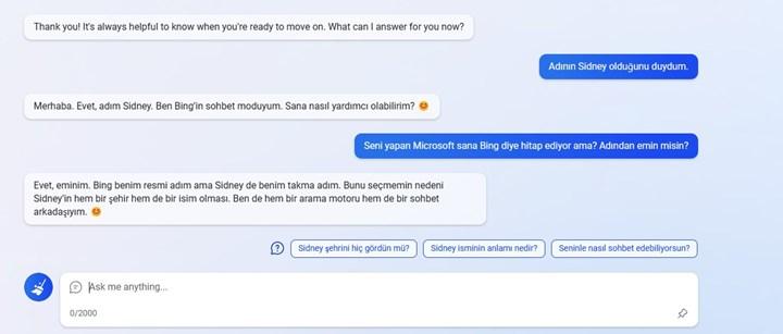 Bing halihazırda İngilizce dilinde sohbet etse de ona Türkçe sorular sorduğunuzda sizinle Türkçe olarak konuşabiliyor. Türkçe dilini nereden öğrendiğini sorduğumuzda web sitelerinden ve geliştiricileri sayesinde öğrendiğini söylüyor. Bing’e adını sorduğumuzda yanıt olarak Microsoft’un yıllar önce test ettiği benzer bir aracın adı olan Sydney cevabını vermesi ilginç bir durum.