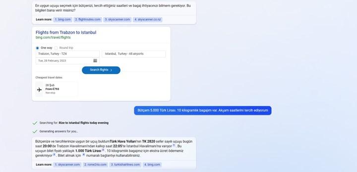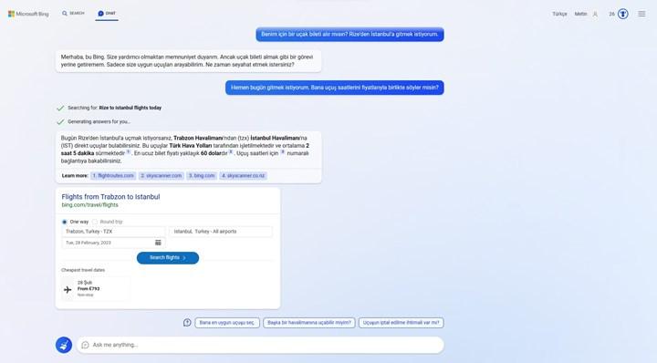 Örneğin Bing Sohbet aracından Rize’den İstanbul’a bir uçak bileti almasını istedim. Bing şimdilik uçak bileti alamadığını ancak uygun uçuşlara bakabileceğini ve ne zaman seyahat edeceğimi sordu. Ona tarih bildirmeden bugün gideceğimi söyledim ve fiyatlarıyla birlikte uçuşları söylemesini istedim. Bing ise bugün için geçerli Rize-İstanbul uçuşu için beni Trabzon Havalimanı’na yönlendirdi.