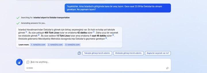 Gerekli bilgileri kendisine verdiğimde bana saat 20:00’da Türk Hava Yolları’nın TK 2820 seferli uçuşunu önerdi ve fiyatının yaklaşık 1.000 TL olduğunu söyledi. İşin ilginç yanı böyle bir uçuş yok. Görmezden gelerek devam ettim ve Bing’ten İstanbul’a gittiğimde gece yarısında Üsküdar’da olmam gerektiğini söyledim. Bana İstanbul Havalimanı’ndan Üsküdar’a gitmem için 400 TL’te taksi (42 dk) veya 15 TL’ye otobüs (1 saat 48 dk) yolculuğu tavsiye etti.