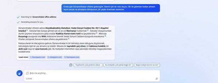 Otobüsü tercih etmem haline Mecidiyeköy Metrobüs durağında inip oradan Üsküdar’a geçmemi söyledi. Ardından kendisine ertesi gün DonanımHaber ofisine gideceğimi, benim için bir rota oluşturmasını ve hediye tavsiyesinde bulunmasını istedim. Konuşmayı devam ettiremedim ancak başka bir sohbette önerdiği akıllı saat hediyesi için kendisine birtakım sorgular yönettim. Kendisinden en iyi akıllı saatler önerisinde bulunmasını ancak güncel verileri kullanmasını istedim.