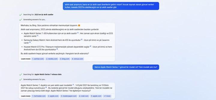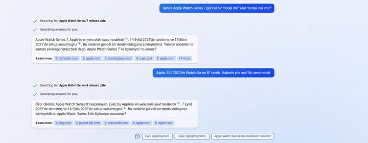 Hazırladığı cevapta Apple Watch Series 7’yi önerdi. Ardından kendisine Watch Series 7’nin güncel olup olmadığını sordum. Bing, kendinden emin bir şekilde Apple Watch Series 7’nin firmanın çıkardığı son model olduğunu ve yeni modelin ne zaman çıkacağının ise henüz belli olmadığını söyledi. Devam sorgusunda Apple Watch Series 8’in piyasaya çıktığını ve yeni bir model olduğunu söyledim.