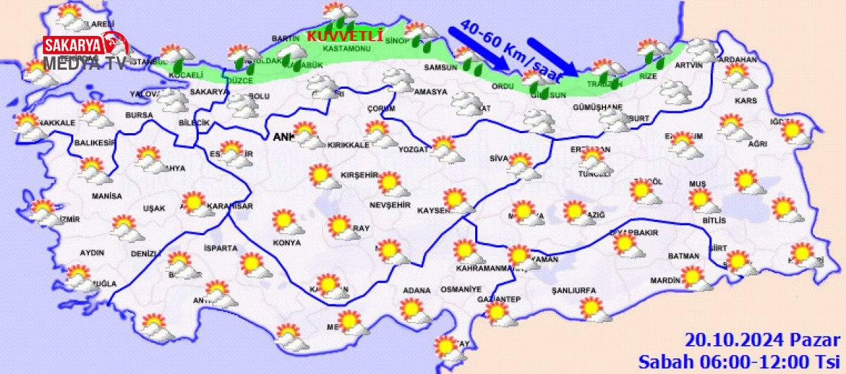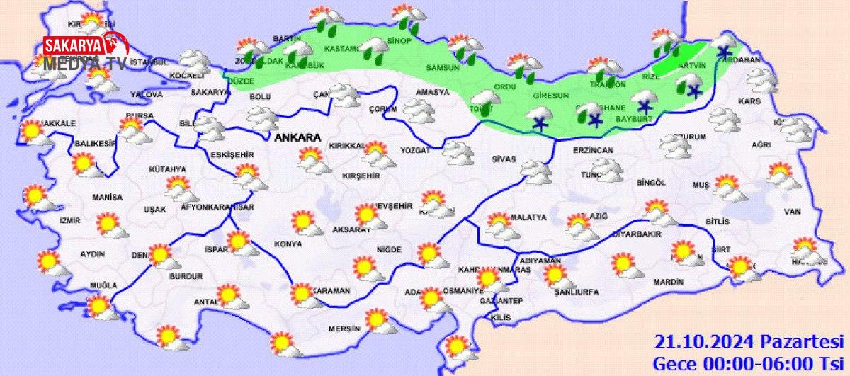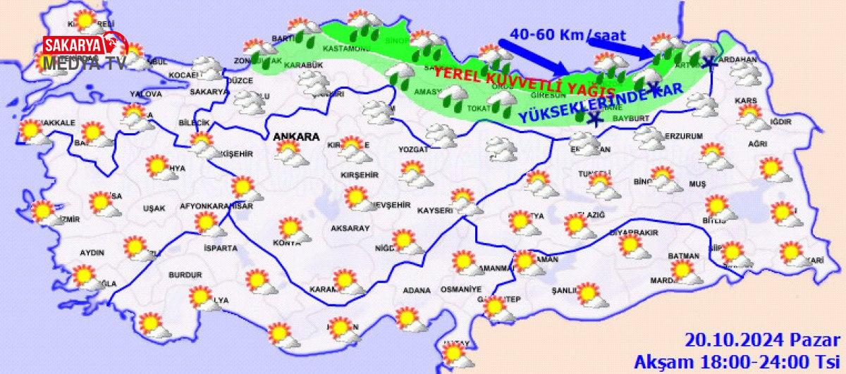 Yağışların, kıyı kısmında kuvvetli olması bekleniyor. SAMSUN °C, 16°CÇok bulutlu, aralıklı yağmur ve sağanak yağışlı geçeceği varsayım ediliyor. Yağışların, akşam saatlerinde kuvvetli olması bekleniyor. TRABZON °C, 17°CÇok bulutlu, aralıklı yağmur ve sağanak yağışlı, yüksek kesitlerinin karla karışık yağmur ve kar yağışlı geçeceği iddia ediliyor.
