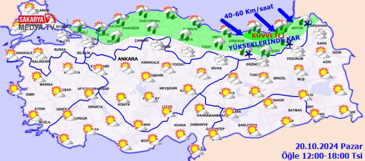 Yağışların, çoklukla yağmur ve sağanak, Doğu Karadeniz’in iç kesitlerinin yükseklerinde karla karışık yağmur ve kar formunda görülmesi bekleniyor. Yağışların, bölgenin kıyı kısımlarında yer yer kuvvetli olacağı iddia ediliyor. Rüzgârın, kıyı bölümlerde kuzeybatı istikametlerden yer yer kuvvetli (40-60 km/saat) eseceği kestirim ediliyor. AMASYA °C, 15°CÇok bulutlu, öğlen saatlerinden sonra yağmur ve sağanak yağışlıARTVİN °C, 12°CÇok bulutlu, aralıklı yağmur ve sağanak yağışlı, yüksek kısımlarının karla karışık yağmur ve kar yağışlı geçeceği varsayım ediliyor.