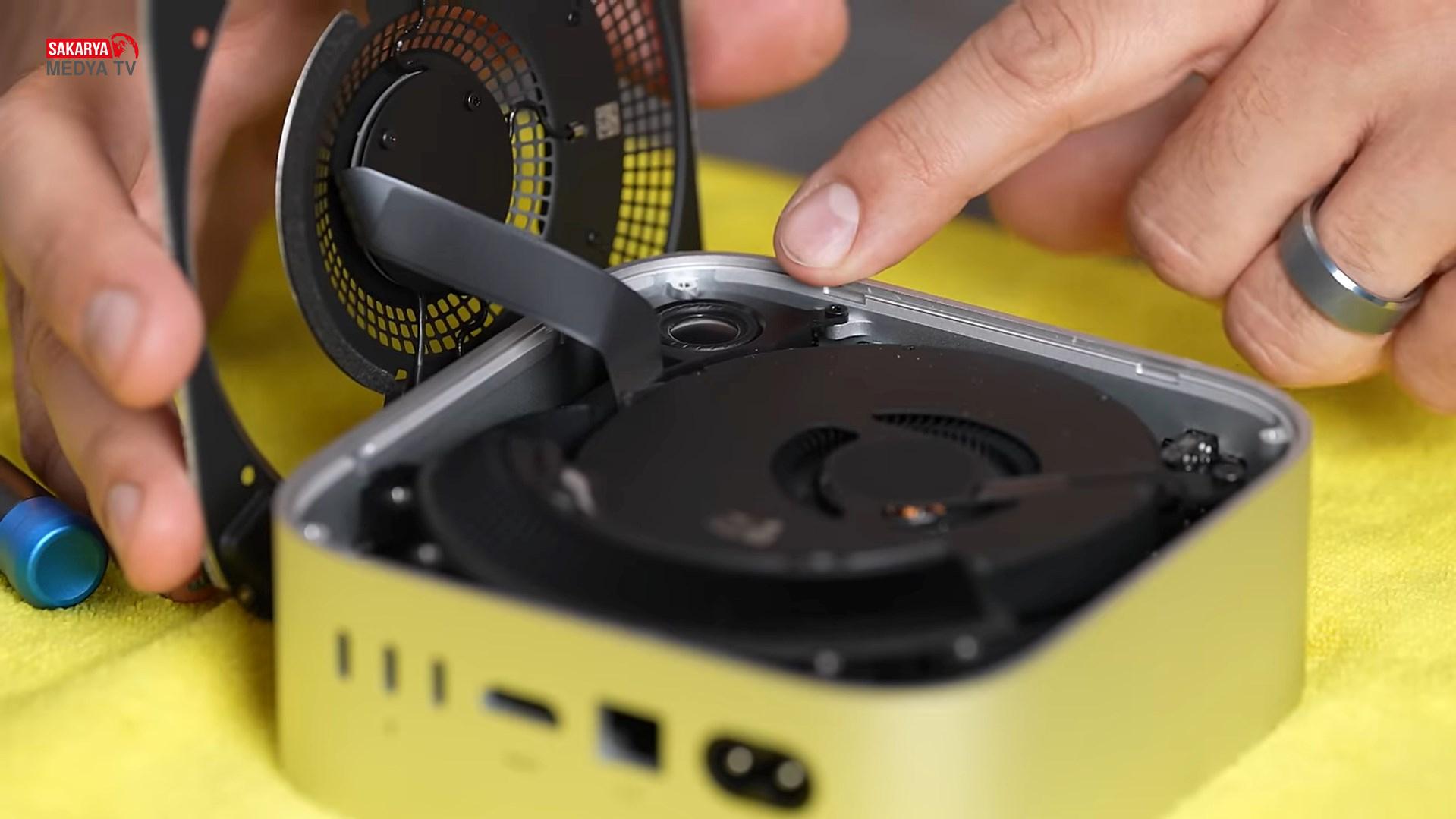 Apple’ın Mac Mini’yle beraber genel olarak tamir edilebilirliği arttırdığı görünüyor. Ön taraftaki Thunderbolt 4 portları dahil bütün bileşenler vidalar ile kolaylıkla sökülebiliyor. Söküm işlemi önceki modelden çok daha kolay gerçekleştirilebiliyor.
