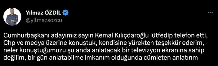 Telefon görüşmesine ilişkin ayrıntıları aktaracak bir ekrana sahip olmadığını belirten Özdil, paylaşımında şu ifadeleri kullandı:”Cumhurbaşkanı adayımız sayın Kemal Kılıçdaroğlu lütfedip telefon etti, Chp ve medya üzerine konuştuk, kendisine yürekten teşekkür ederim, neler konuştuğumuzu şu anda anlatacak bir televizyon ekranına sahip değilim, bir gün anlatabilme imkanım olduğunda cümleten anlatırım.”