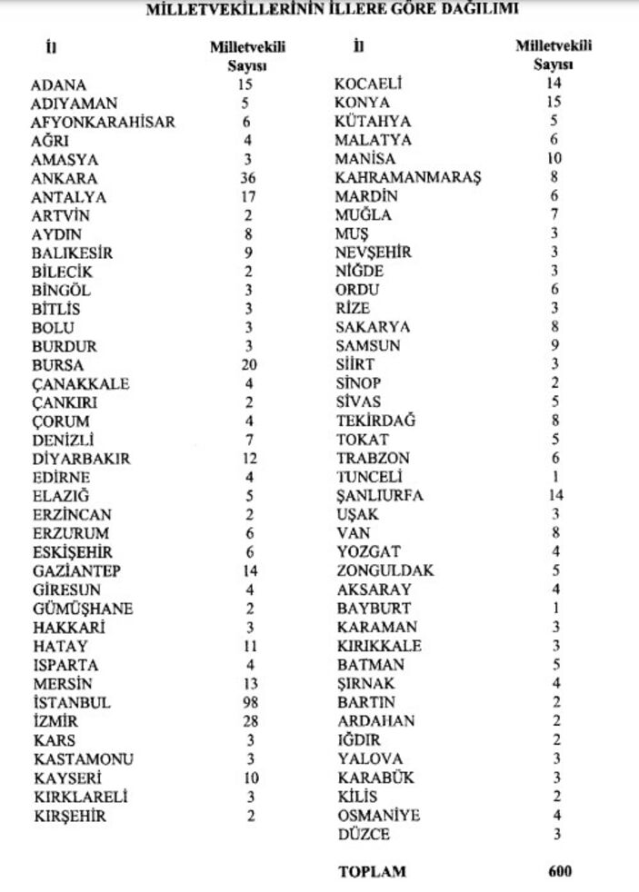 Türkiye geneli toplam 600 milletvekili