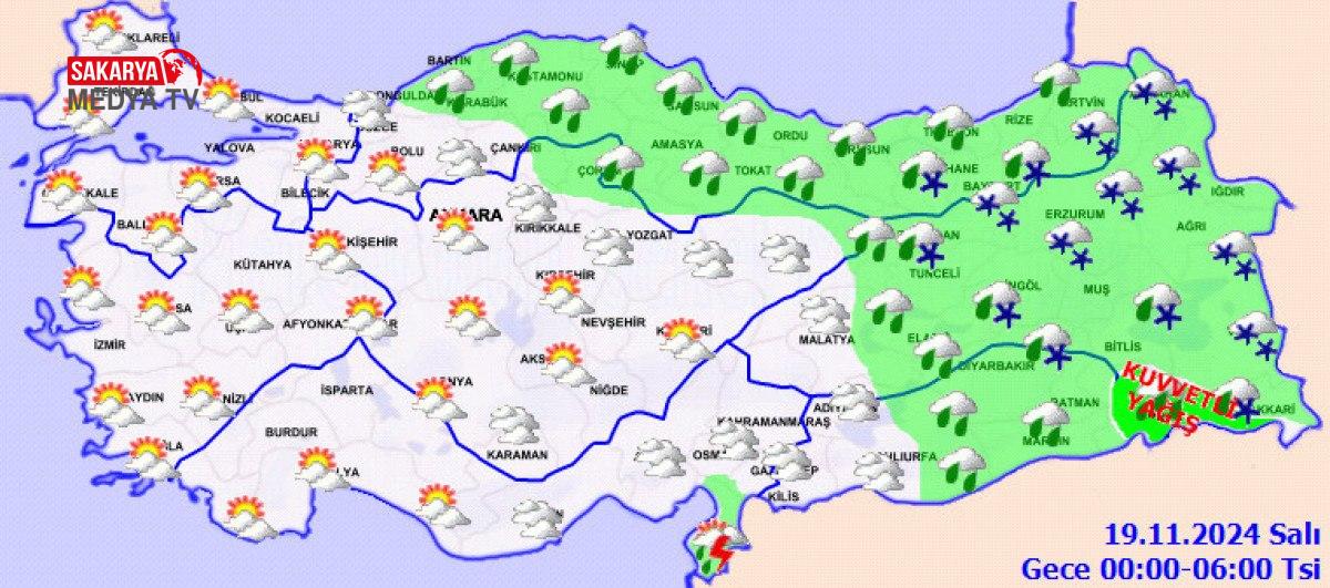 Çoklukla yağmur ve sağanak kuzey ve doğu kesitlerinin yükseklerinde karla karışık yağmur ve kar halinde olması beklenen yağışların, güney kısımlarında yer yer kuvvetli olacağı kestirim ediliyor. ERZURUM °C, 8°CParçalı ve çok bulutlu, aralıklı yağmur ve karla karışık yağmurlu, yüksek kısımları kar yağışlıKARS °C, 8°CParçalı ve çok bulutlu, öğlen saatlerinden itibaren aralıklı yağmur ve karla karışık yağmurlu, yüksek kesitleri kar yağışlıMALATYA °C, 11°CParçalı ve çok bulutlu, aralıklı yağmur ve sağanak yağışlı geçeceği kestirim ediliyor. Yağışların, sabah saatlerinde yer yer kuvvetli olması bekleniyor. VAN °C, 10°CParçalı ve çok bulutlu, öğlen saatlerinden itibaren aralıklı yağmur ve karla karışık yağmurlu, yüksek kısımları kar yağışlı