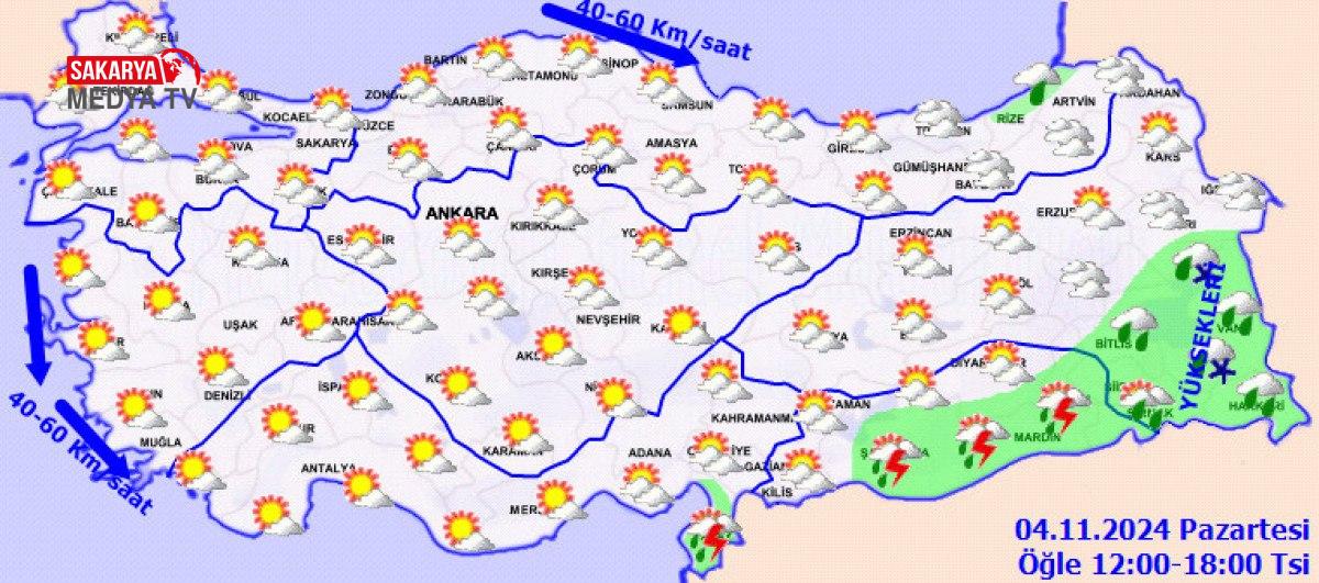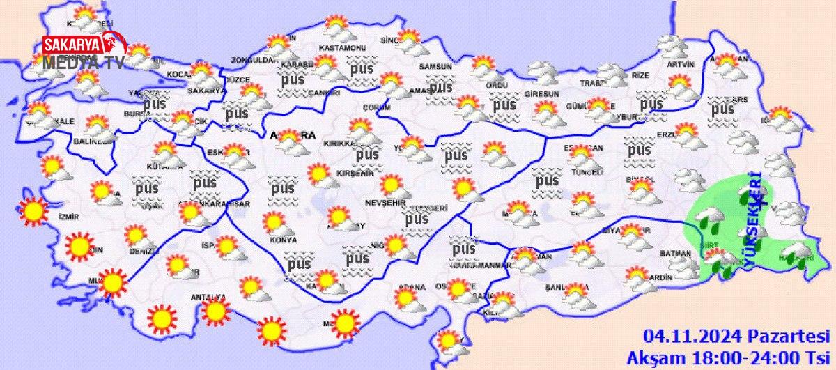 Parçalı ve çok bulutlu, Şanlıurfa, Mardin, Batman ve Siirt etraflarının sağanak ve gök gürültülü sağanak yağışlı geçeceği iddia ediliyor. Sabah ve gece saatlerinde bölgenin kuzey kesitlerinde pus ve yer yer sis bekleniyor. DİYARBAKIR °C, 19°CParçalı ve çok bulutluGAZİANTEP °C, 20°CParçalı ve çok bulutluSİİRT °C, 18°CParçalı ve çok bulutlu, öğlenden sonra sağanak yağışlıŞANLIURFA °C, 19°CParçalı ve çok bulutlu, sağanak ve gök gürültülü sağanak yağışlı