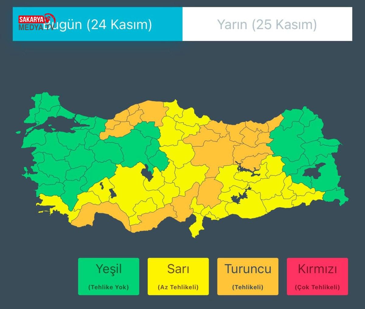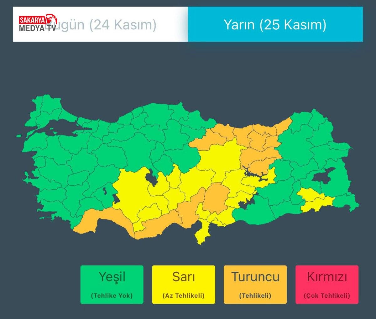 MGM’nin yeni raporuna nazaran bugün prestijiyle 30 kente “sarı”, 20 kente “turuncu”, yarın ise 16 şehre “sarı”, 13 kente “turuncu” kodla yağış uyarısı verildiği belirtildi.