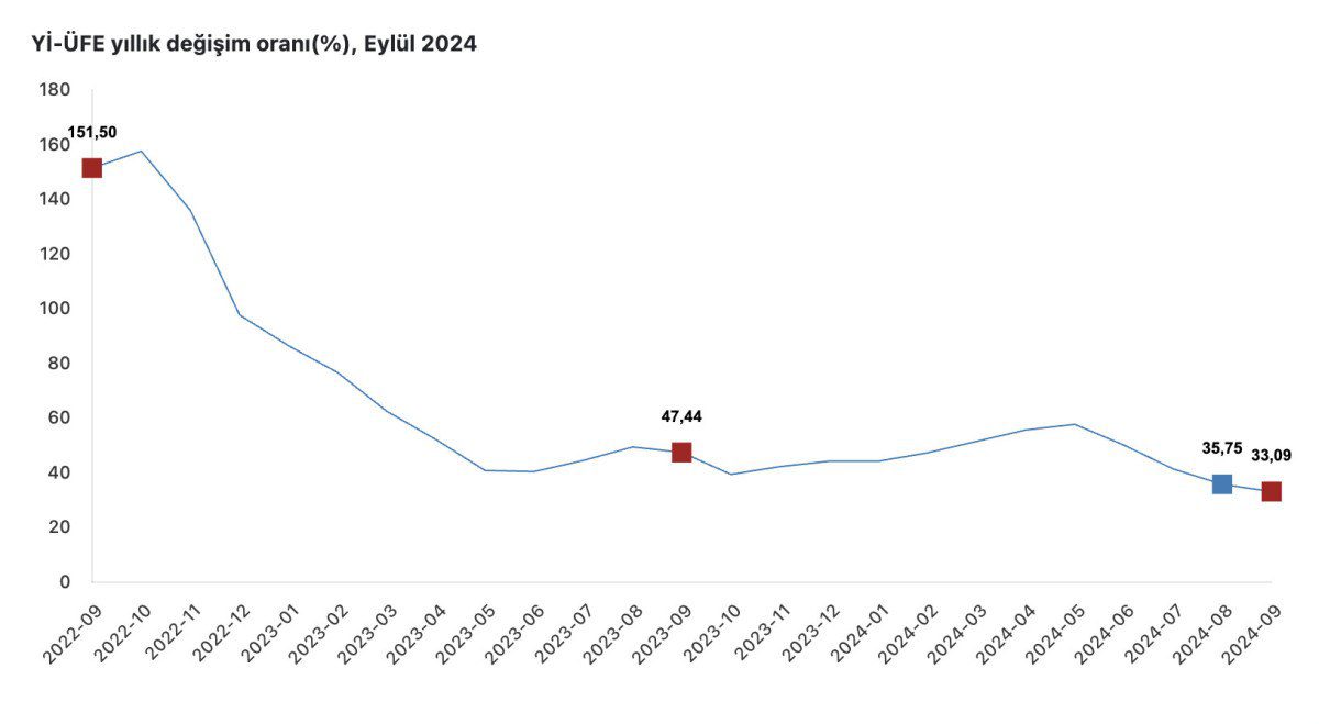 AA Türkiye İstatistik Kurumu (TÜİK) verilerine göre, Yurt İçi Üretici Fiyat Endeksi (Yİ-ÜFE) eylülde, bir önceki aya kıyasla yüzde 1,37, geçen yılın aralık ayına göre yüzde 25,55, geçen yılın aynı ayına kıyasla yüzde 33,09 ve 12 aylık ortalamalara göre yüzde 44,81 artış gösterdi. Verideki sanayi sitesindeki yıllık değişimler dikkat çekti.